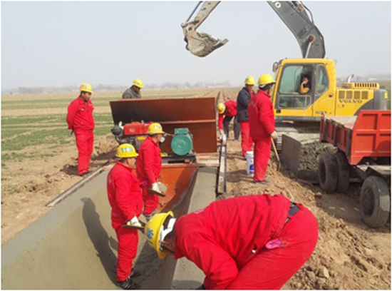 工程還有另外一個難點在于:沒有準(zhǔn)確的設(shè)計圖紙作為依據(jù)進行施工。工程分為1條支渠、6條斗渠、以及眾多農(nóng)渠,施工線路較長,穿越村莊較多,有時一條渠道穿越2至3個村莊,每個村莊要求進行的施工線路不能夠進行統(tǒng)一,并且在14年底,部分村莊村干部換屆選舉后,人員部分進行變化,新老村干部對施工的想法不同或者不能良好的交接,也給施工帶來了一定的難度,所以項目部采用邊協(xié)調(diào)、邊設(shè)計、邊施工的方法進行施工,每一條渠道的測量及放線工作基本不下于8次,施工技術(shù)人員王楓、邊志鵬、王冠雄的工作量,相應(yīng)的也都加大了,他們本著認(rèn)真、務(wù)實的態(tài)度,每天開著自己的車奔波在不斷變更、不斷重復(fù)的施工線路上。